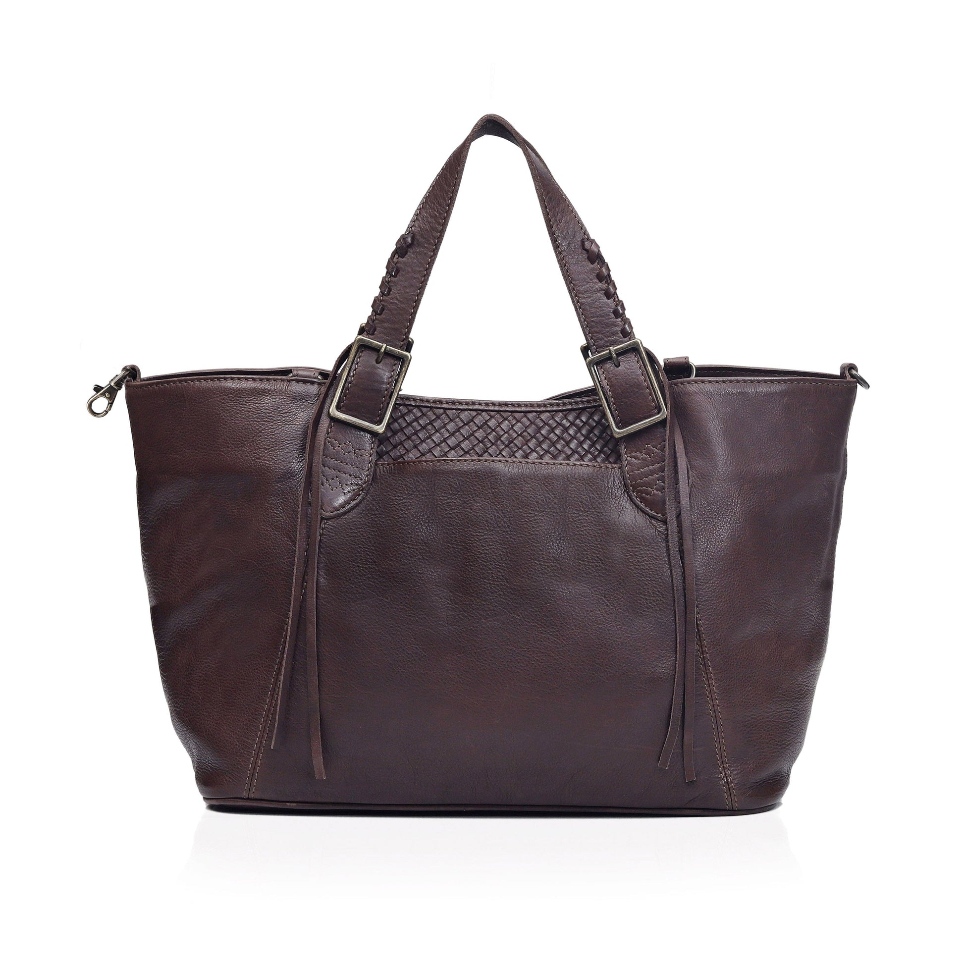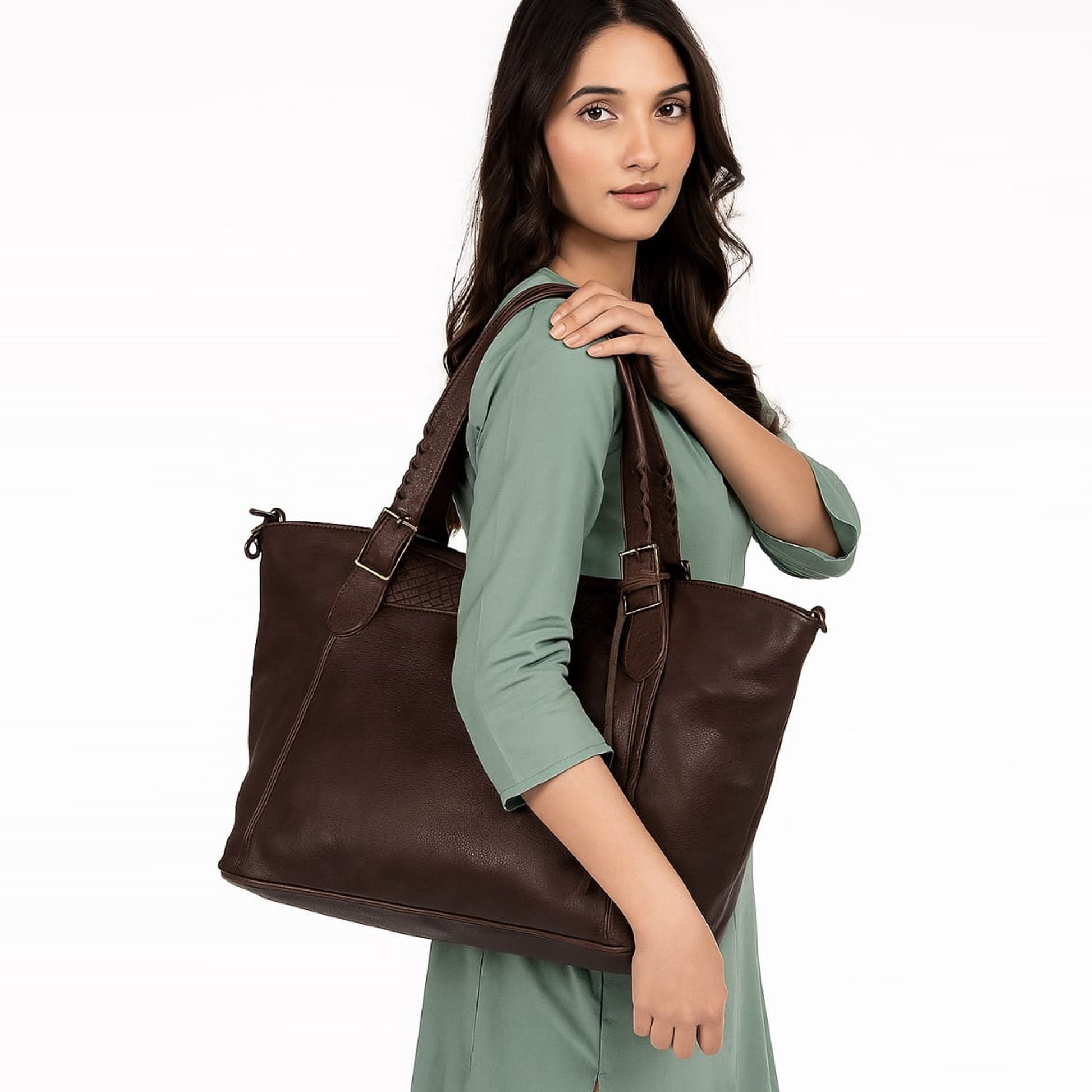 Spacious in design, the bag features a large main compartment that easily fits laptops, books, or daily essentials, along with interior pockets to keep smaller items organized. Sturdy leather handles ensure comfortable carrying, while the durable build promises long-lasting use.