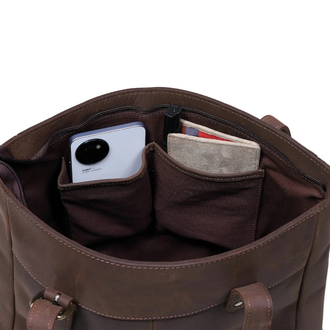 Designed for functionality and sophistication, the spacious interior easily accommodates your daily essentials - laptop, wallet, books, and more - while interior pockets keep smaller items organized. Sturdy leather handles ensure comfortable carrying, and the reinforced base provides extra support for heavier loads.