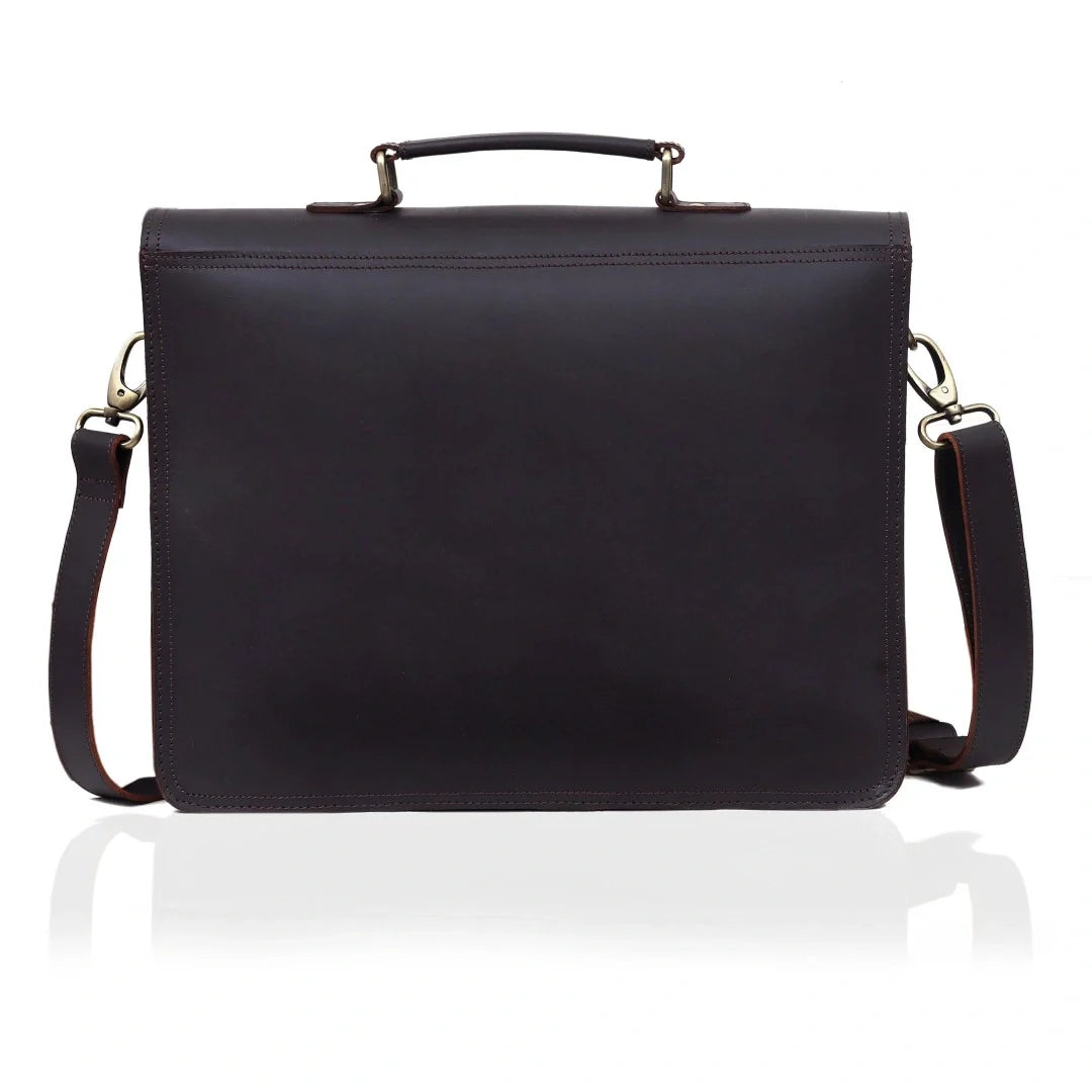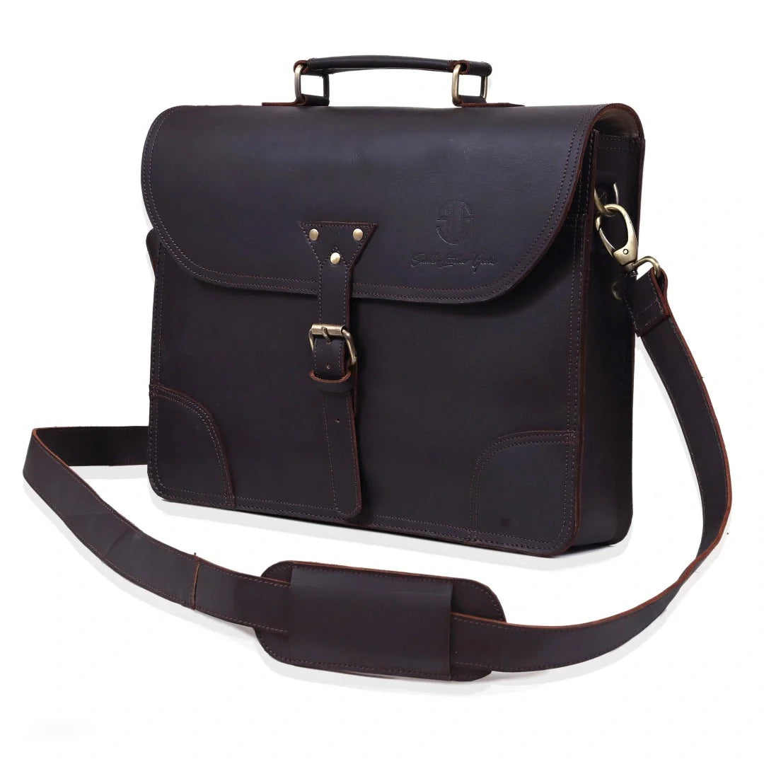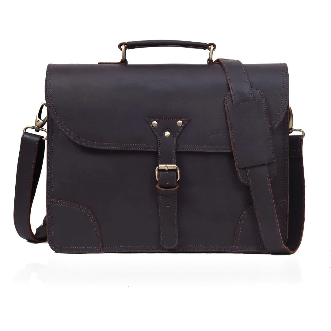 Crafted from premium full-grain buffalo leather, this elegant briefcase combines timeless style with modern functionality. Its smooth, rich texture develops a beautiful patina over time, showcasing the character of the leather. Designed for professionals, the briefcase features a spacious main compartment with a padded laptop sleeve, multiple interior pockets for documents, pens, and accessories, and a secure zippered closure. An adjustable shoulder strap and sturdy top handle provide versatile carrying options, while antique brass hardware adds a sophisticated touch. Ideal for business, travel, or everyday use, this leather briefcase balances durability with refined craftsmanship.