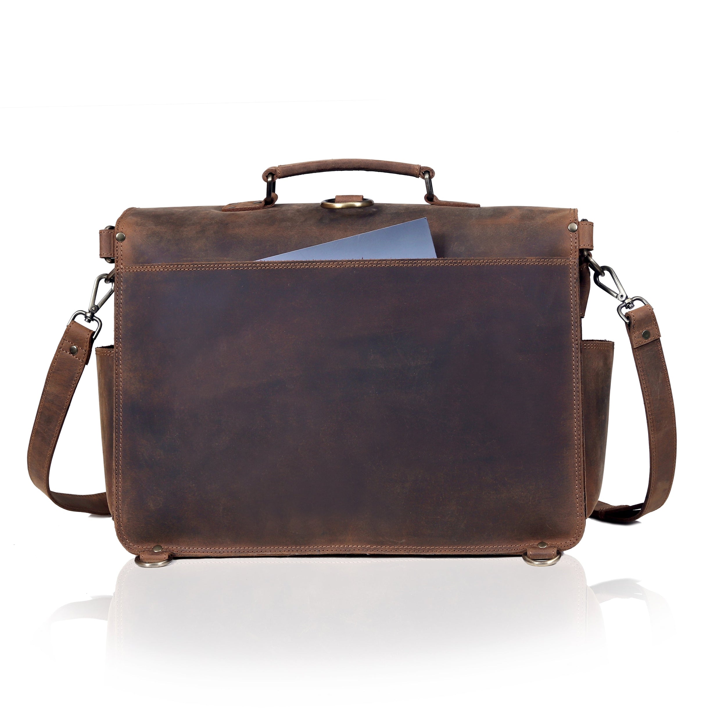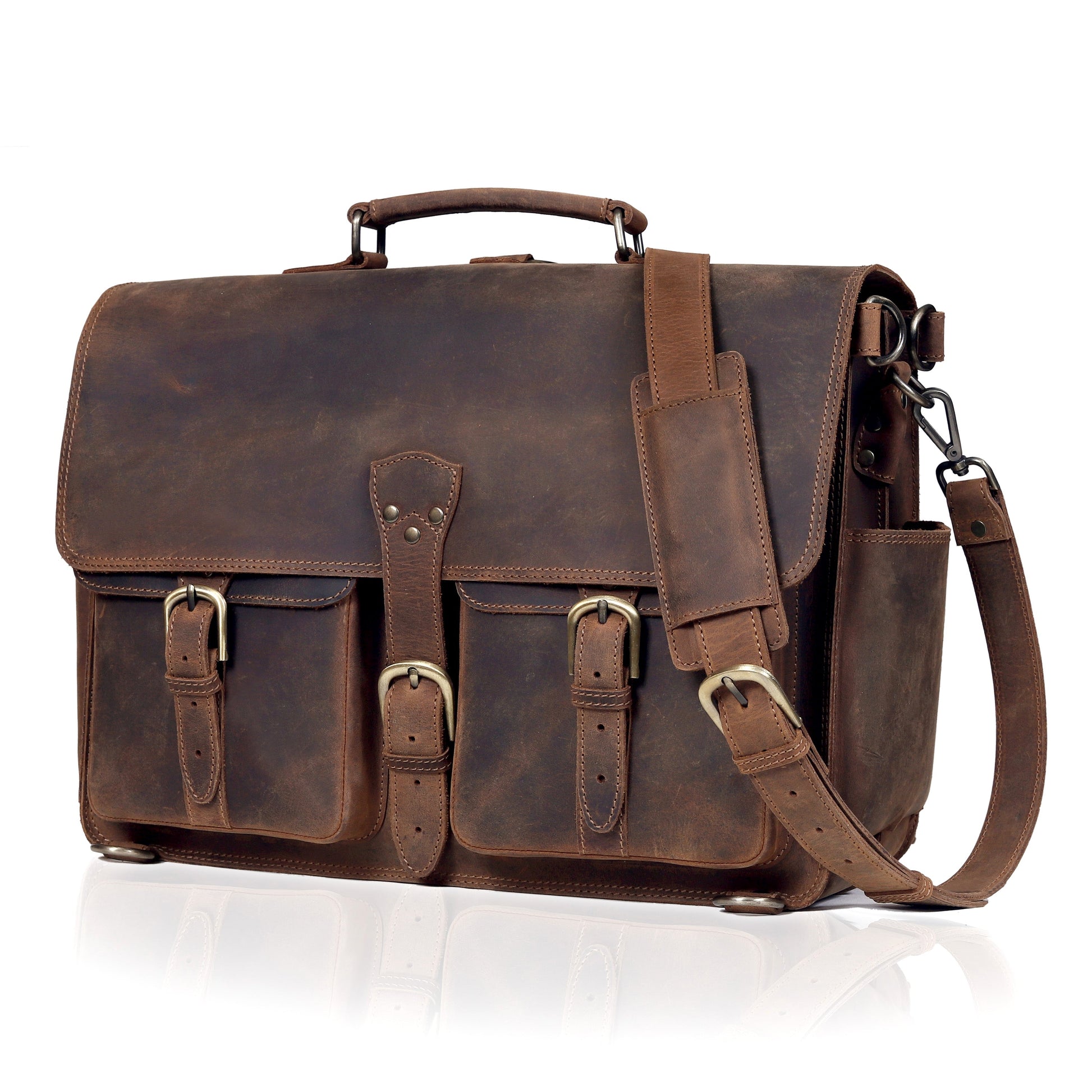 Reinforced stitching and sturdy brass hardware ensure durability, while the adjustable, detachable shoulder strap and padded leather handle offer comfortable carrying options. Whether you're commuting to work, heading into meetings, or traveling for business, this briefcase adds a touch of vintage sophistication to your everyday routine.